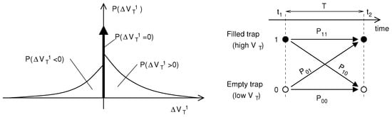 The experimental data just reported call for a consistent model able to explain the different features of the phenomenon. While data shown in Figure 7 can be reproduced by a simple exponential fit [], the explicit time dependence captured by Figure 8 and Figure 9 requires a time-dependent analysis, that was first put forward in [,]. The starting point is the exponential distribution of shift extracted from simulation results described in Section 3.2.1. Such a distribution describes a positive shift between time and if an empty trap at is filled at and a negative shift if the opposite is true. If the trap state does not change, a zero shift holds. The final time-dependent distribution is then the one shown in Figure 12 (left), where the positive and negative exponentials and the zero-shift delta function must be weighted by their occurrence probabilities, representing their areas. This is accomplished describing the RTN process as a two-state Markov process [,], as depicted in Figure 12 (right). The two states correspond to the empty (low-, state 0) and filled (high-, state 1) trap. Considering constant capture and emission times and , the transition probabilities between state i and j, , over a time interval T become:
