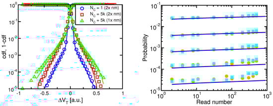 Typical comparisons between model results and experimental data are reported in Figure 13 for NAND [] and NOR [] arrays. The left-hand side shows that a nice agreement can be achieved for different technologies and cycling conditions. In particular, because of the exponential nature of , its slope matches what is obtained from array data and resulting from the convolution operation in (13). The right-hand size is instead related to data reported in Figure 9 (left), where RTN distributions for increasing read operations (i.e., time) are reported, and shows the probabilities at fixed values as a function of the number of read operations. The increase in the RTN figure is well reproduced by the model and can now be explained: the increase in the elapsed time between the read operations (i.e., T in Equation (Section 3.2.3)) allows for more and more traps to be activated, as their becomes comparable with T. This increases the randomness of , enlarging the RTN distribution. This effect was nicely shown in [,] as an extension with time of the oxide region whose traps are sampled by RTN.