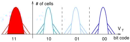 NAND Flash cells adopt channel Fowler–Nordheim (FN) tunneling to store electrons onto their floating gates []. To this aim, the selected cell is first connected to the external circuitry by biasing the unselected WLs to a pass voltage and turning on the DSL, while the BL is grounded and the SSL is left off. A high voltage is then applied to the desired WL, resulting in tunnel electron injection from the inverted substrate to the floating gate. In MLCs or TLCs, fine placement of the levels is needed because of the reduced distance between adjacent distributions (see Figure 2). This is achieved via an incremental step-pulse programming (ISPP) technique [], in which fast pulses of increasing amplitude are used to inject a constant, controlled amount of charge onto the floating gate at each step, interleaved with program verify phases in which is monitored. Several refinements are applied to this basic concept in 8- or 16-level cells [].