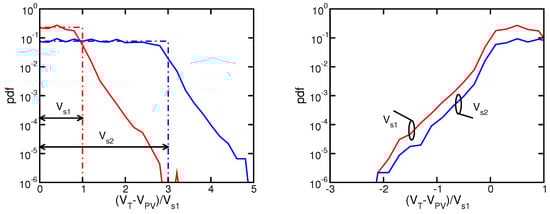 To investigate this issue in more detail, Figure 15 shows the effects of RTN on the programmed distribution [] following ISPP and successive read. The left-hand side shows the pdf right at the end of the ISPP algorithm, for two values of the ISPP step: and . In the ideal case, the algorithm is expected to result in a distribution exceeding the program-verify level by an amount at most equal to the ISPP step (dashed lines in Figure 15). In reality, the distributions are widened by the program noise (not discussed here, see [,]) and by RTN and display the characteristic exponential tails. Note that no cell can have values below the program-verify level, as the algorithm would apply an additional step to them. However, a negative RTN tail also arises as soon as the cells are read (right-hand side of Figure 15). This figure also shows that the RTN tail height is smaller for larger values of the ISPP step; however, increasing its value will lead to an overall larger distribution. On the other hand, reducing the ISPP step is effective—apart from the increase in program time—only until its value becomes comparable with the RTN distribution width.