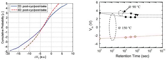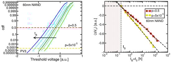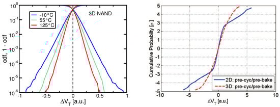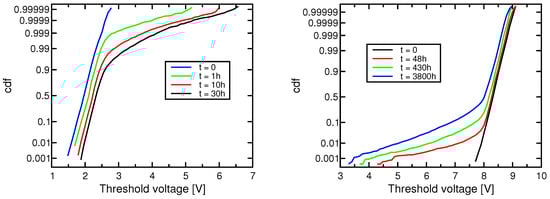 cdf over time for nm NOR Flash cells arrays after cycling. Positive control-gate bias ( V) was applied in the left-hand side figure, while the right-hand side shows results of a retention experiment [], © 2001 IEEE.