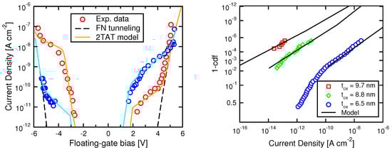 This enhanced leakage, called anomalous SILC, has been also identified as a trap-related phenomenon, because of its low activation energy [,] and fluctuations resulting from capture/emission processes [,]. However, a two-trap assisted tunneling process (2TAT) has now been invoked to explain the experimental data of individual cells [,], as depicted in Figure 17c. From this view, a picture of the SILC distribution in a Flash array can be built, assuming a statistical distribution of stress-generated oxide defects (Figure 17b): those cells that happen to have two traps close enough to allow significant tunneling will be affected by anomalous SILC [,], while the majority will only experience SILC or the FN tunneling current. Figure 18 shows an example of gate leakage current of two cells affected by anomalous SILC compared with the 2TAT model predictions (left), and (right) the statistical distribution of SILC at a given control-gate bias for different oxide thicknesses, again compared with results of the statistical model. From there, reliability extrapolations can be performed to estimate the number of failures. Other extrapolations procedures have been proposed, based on the same model or on empirical approximations [,,,,,,,,], while addressing the optimization of the P/E waveforms and cell design [,,,].