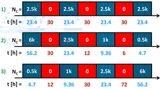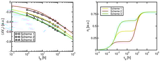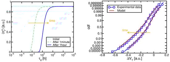Once the analysis for a given set of , is assessed, we must account for their statistical distribution among the traps. The original approach in [] relied on the classical theory of direct tunneling into oxide defects [,], explicitly linking and to the space and energy position of the trap inside the oxide. Later results have, however, shown that capture/emission times in MOSFETs are not compatible with such a description [,], due to device variability effects on the time constants [,,] and structural relaxation of defects [,], generating a large spread in time constants even for traps located close to the silicon/oxide interface and disrupting the classical correlation between and . The study of the microscopic properties of RTN traps is still an active research topic [,,,,,,,], but for our purposes we will adopt a pragmatic approach, assuming given distributions of capture/emission time constants that may be consistent with observations, without linking them to any particular trap location. A constant PDF on a log-time scale was successfully assumed in [], such as the one that will be used to describe detrapping after cycling in Section 3.4.2. It is worth noting that the constant trap density adopted in [] implicitly provides a similar time constant distribution, due to the exponential nature of the tunneling probability, the only difference being the lack of correlation between and and between the time constant and the spatial location of traps. Within this framework, the expression for the single-trap shift pdf, , becomes