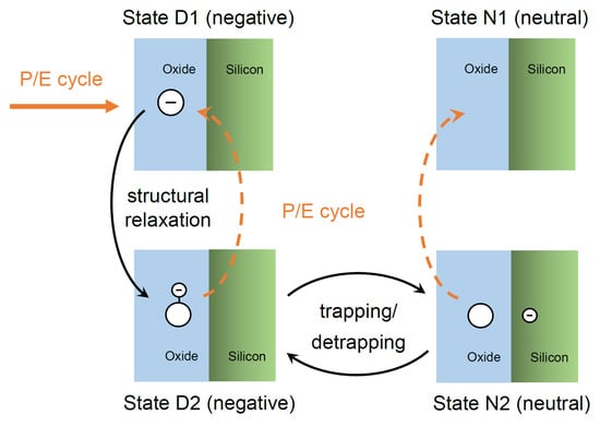Like most reliability concerns for Flash memories, this phenomenon is one consequence of the electron flow through the oxide during FN tunneling, which has been observed to generate oxide traps and fixed charge in MOS (Metal-Oxide-Semiconductor) devices since the 1980s [,,,,,]. At first glance, such charges should result in a constant shift of both levels, while the actual behavior features a milder dependence on by the programmed with respect to the erased one, pointing toward an interplay among different mechanisms. This picture is confirmed by early results on different non-volatile memory technologies, where different P/E schemes (i.e., different electron injection conditions into the oxide) resulted in different dependences on [].