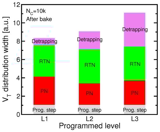 where q is the electron charge, the oxide capacitance per unit area, W and L the channel width and length, respectively, and the electron mobility in the inversion channel, which experiences a fluctuation over an area as a consequence of the additional scattering with the trapped electron. Typical values for the first term are smaller than , while the scattering part is typically negligible in the subthreshold regime, where NAND cells are usually read; therefore, RTN has long been regarded as a curious scientific phenomenon not constituting a noticeable reliability threat. This held true even if unusually large values for the RTN amplitude had been consistently reported on some devices, together with complex time behaviors [,,,,], that seemed to defy Equation (2). When Flash memories made a large quantity of data readily available, making it possible to pinpoint and study anomalous behaviors occurring with extremely low probability, larger and larger fluctuation amplitudes emerged [,], and RTN became a serious reliability constraint in static random-access [,,] and Flash memories [,,,,,,], prompting an intensive research effort to understand its root cause and impact on memory array operation.