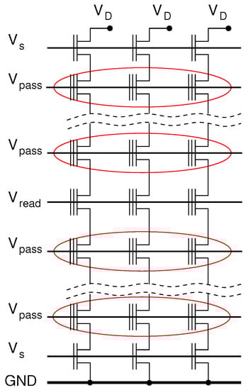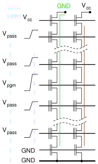 Reading the state of a cell means discriminating one level against another and irrespective of the levels of all other cells in the string. To accomplish this, the string has first to be connected to the sensing circuit, i.e., the select lines are high and the BL is biased; therefore, a current can flow to the (grounded) sourceline. Unselected cells are then placed in a pass-transistor mode, biasing their WLs at a pass voltage larger than the maximum . The actual read operation is then performed, sensing the cell current and comparing it against fixed reference values to assess the corresponding binary code []. The operation is performed more than one time for MLC and TLC cells. To increase parallelism, strings are read in parallel across a page (typically 8–16 kB), resulting in a throughput higher than 150 MB s.