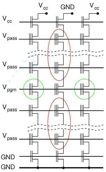 - Park, K.T.; Lee, S.; Sel, J.S.; Choi, J.; Kim, K. Scalable wordline shielding using dummy cell beyond 40 nm NAND Flash memory for eliminating abnormal disturb of edge memory cell. Jpn. J. Appl. Phys. 2007, 46, 2188–2192. [Google Scholar] [CrossRef]
