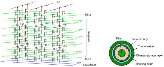 - Chang, K.P.; Lue, H.T.; Chen, C.P.; Chen, C.F.; Chen, Y.R.; Hsiao, Y.H.; Hsieh, C.C.; Shih, Y.H.; Yang, T.; Chen, K.C.; et al. Memory architecture of 3D vertical gate (3DVG) NAND Flash using plural island-gate SSL decoding method and study of its program inhibit characteristics. In Proceedings of the 2012 4th IEEE International Memory Workshop (IMW), Milan, Italy, 20–23 May 2012; pp. 25–28. [Google Scholar]