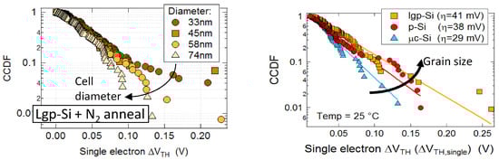 - Degraeve, R.; Toledano-Luque, M.; Suhane, A.; den bosch, G.V.; Arreghini, A.; Tang, B.; Kaczer, B.; Roussel, P.; Kar, G.S.; Houdt, J.V.; Groeseneken, G. Statistical characterization of current paths in narrow poly-Si channels. In Proceedings of the 2011 International Electron Devices Meeting (IEDM), Washington, DC, USA, 5–7 December 2011; pp. 287–290. [Google Scholar]