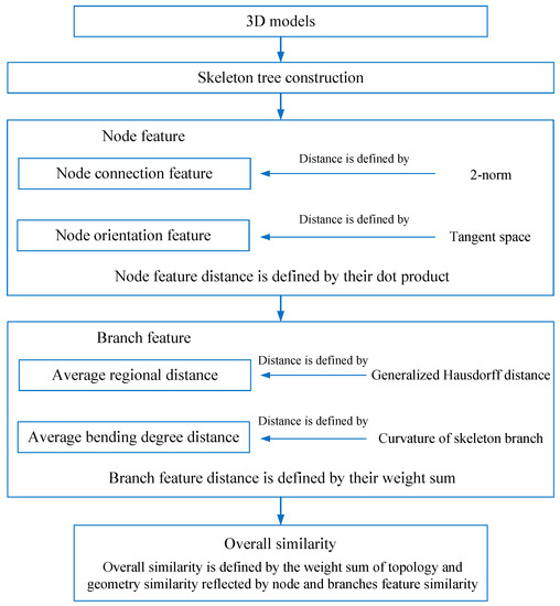Initially, a simple rule of skeleton tree construction is proposed with the help of a skeleton, which completely retains the topologic information of the model. Next, the node feature is described from two sides, the node connection feature and the node orientation feature. The former directly reflects how to connect with the sub-parts in the model. The latter has an ability to distinguish a model with similar topology but a different shape, which is usually overlooked by existing methods. Node connection distance and orientation distance are defined by 2-norm distance and tangent space distance, respectively. The final node feature distance is expressed by the dot product between them. Then the branch feature is used to depict the geometric features of the model, which mainly takes an average regional feature that can reflect the contours of the model and an average bending degree feature that can take bending into account. In calculating average regional distance, we first define three geometric properties for skeleton points, including relative support angle, relative density, and relative anchor point distance. Then the generalized Hausdorff is used to compute the distance between two skeleton point sets. We take this distance as the average regional distance. Average bending degree distance is defined by the curvature of a skeleton branch. Final branch feature distance is expressed by the weighted sum of these two distances. Finally, the overall similarity of skeleton trees is defined as the weighted sum of topologic and geometric similarity, reflected by node and branch feature similarity. The weight of topology and geometry can be adjusted according to different models. If the difference in topology between two models is larger, we give topology a larger weight. If the difference in geometry is larger, we give geometry a larger weight. If topology and geometry have an equal effect on the model, we give them same weight (0.5). A flow chart of our method is shown in Figure 1.