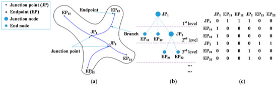 Mapping skeleton to skeleton tree and corresponding adjacent matrix: (a) skeleton and classification of skeleton point; (b) skeleton tree; (c) adjacent matrix.