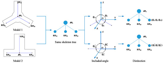 Even if two skeleton trees have similar topologic features, their corresponding models are likely to be different. As shown in Figure 3, Models 1 and 2 have different structures but have the same skeleton trees. To distinguish them, we add orientation feature to node in the skeleton tree. This can be easily achieved by calculating the included angle between two vectors. One vector is formed by JP and an EP connecting with it, and another is formed by JP and another EP connecting with it. The direction of the vector is from JP to EP. In each calculation, setting JP as origin and establishing the coordinate system . Supposing EP11 (), EP12 () and JP1 (0,0,0), the included angle between and can be calculated by the following formula.