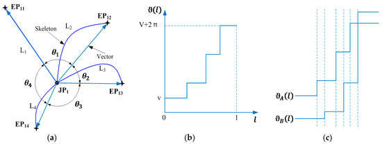 Supposing that a level of a skeleton tree has included angles . Starting from and defining as rotation angle between and , then ; similarly, . We define the tangent space description of the included angle as . The horizontal axis represents the normalized skeleton length, and , is the sum of two skeleton branch lengths forming one included angle . The vertical axis represents the acceleration of the rotation angles , as shown in Figure 4a,b. Through the normalized skeleton length, the domain of the tangent space of included angles is adjusted to 1, which means is a function with a domain of [0,1] in R space. is a monotonic function. The starting point is a value ν and the end point is a value ν+ 2π.