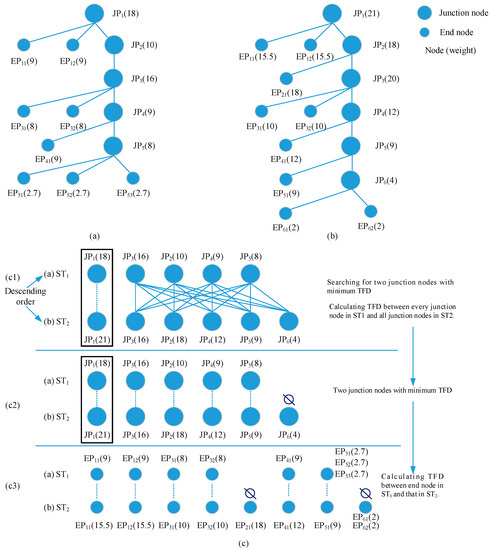 Root node Priority principle: (a) ST1; (b) ST2; (c) searching for two nodes with minimum TFD. (c1) descending order for junction nodes in ST1 and ST2, (c2) searching for two junction nodes with minimum TFD, (c3) calculating TFD between two end nodes corresponding to two junction nodes in (c2).