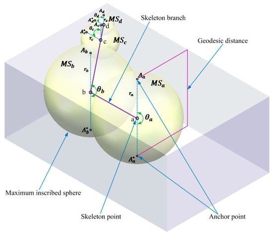 Take a maximum inscribed sphere with any skeleton point as the center of the ball and the boundary surface having at least two tangent points. These tangent points are regarded as anchor points of skeleton point . As shown in Figure 6, and are the anchor points of skeleton point x.