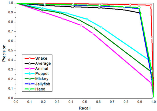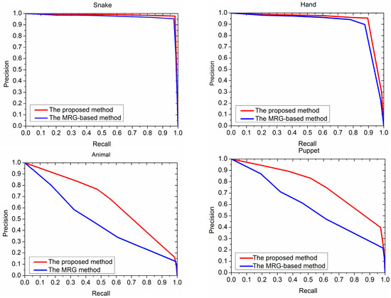 Finally, Figure 9 shows the precision-recall plots for four selected classes—snake, hand, animal and puppet—computed by the proposed method and the MRG-based method, respectively. It is worth remembering that curves moved upwards and to the right represent better retrieval performance. The curves obtained by the proposed method are higher than the curves obtained by the MRG-based method, which means the proposed method has a better retrieval performance and higher retrieval accuracy under the same conditions.