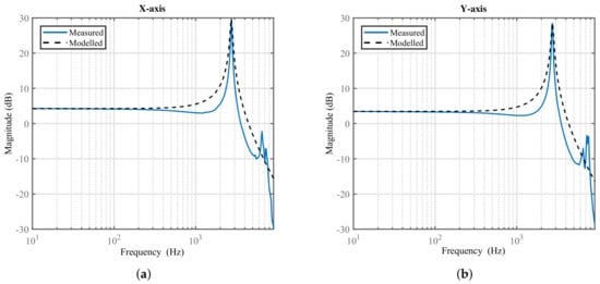 Comparison between the measured magnitude response and modelled of the system in the open-loop: (a) X-axis; (b) Y-axis.