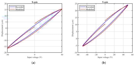 Measured and modelled hysteresis loops show that the hysteresis model accurately captures the hysteresis of the piezo actuators: (a) X-axis; (b) Y-axis.