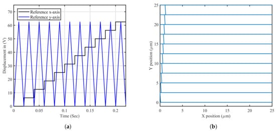 In nanopositioning applications, scanning in a raster pattern is required. The raster scan is achieved by applying a staircase signal to the y-axis and a triangular wave to the x-axis. The nanopositioning platform then moves forwards and backwards along the x-axis and it moves in a small step on the y-axis. The period of the step signal is the same as triangular in a synchronised pattern. It is important to note that the piezo-actuators used in nanopositioning applications are uni-polar actuators. This leads to the condition that only positive voltage can be applied to avoid depolarisation; as a result, bias is generally added. This allows the Alternating Current (AC) signals to be applied on top of the bias. Therefore, as can be seen from Figure 4a, the triangular signal has only a positive part mimicking a uni-polar condition and the period of the step signal is equivalent to the period of the triangular waveform. The proposed nanopositioning platform has a scanning range of 25 m in each axis and 2.5 m per 1 V sensor gain. In order to obtain a scanning range of 25 m × 25 m, a triangular waveform with 25 Hz and an amplitude of 62.5 V, a staircase with peak amplitude of 62.5 V and step changes of 2.5 m are selected to drive the platform. For simplicity and clarity reasons, the step change is larger than 1 m in order to cover the entire scanning range with 10 steps. The expected trajectory is plotted in Figure 4b.