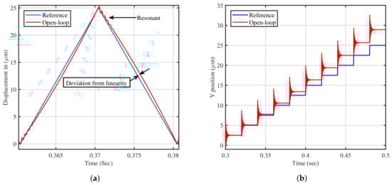 As explained, a triangular wave with a fundamental frequency of 25 Hz is applied to drive the x-axis of the nanopositioner, and a synchronised staircase signal with fixed step changes is used to drive the y-axis. The open-loop tracking performance is performed using the MATLAB simulation and evaluated using reference tracking. It can be observed that tracking the triangular wave is nonlinear and oscillatory, as can be seen from Figure 5a. The triangular wave also deviates from the linearity in tracking its reference due to hysteresis nonlinearity of the piezo-actuators used in the nanopositioning platform. Mechanical vibration is also observed at the high-frequency components of the triangular wave. The staircase tracking is also nonlinear and oscillatory, particularly at the step changes where the system is highly susceptible to experience mechanical vibration, as is clear from Figure 5b. The mechanical vibration is observed in both the x- and y-axis of the platform due to the lightly damped mechanical resonance of the platform. To conclude, the open-loop tracking performance is unsatisfactory and therefore it is not suitable for precise control.