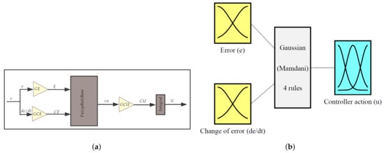 This work has thus far focused on linear controllers; however, nonlinear controllers have begun to be implemented in many studies. This research will investigate a nonlinear control strategy for better performance. The FLC will be used as a tracking controller to mimic the integral action, as will become clear in this section. The FLC is used in conjunction with the IRC instead of conventional (PI) or (I) tracking controllers in a single- and dual-loop fashion, as is clear in Figure 7a,b.