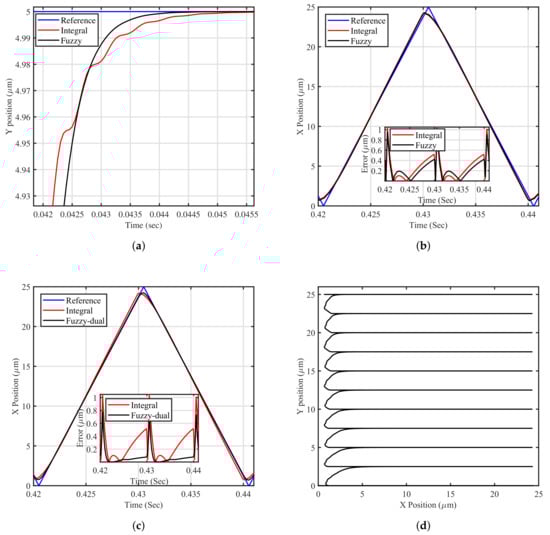 Therefore, scanning in the x-axis using dual-loop fuzzy is preferred and the generated raster scan is created using a single-loop fuzzy to drive the y-axis and dual-loop fuzzy to drive the x-axis, as is clear in Figure 9d. The raster scan is smoother in the y-axis with less vibration, and it is more linear in the x-axis, as is evident from Figure 9a,b. It is noted that hysteresis of the piezo-actuators is amplitude-dependent; it exhibits highly nonlinear behaviour when a high amplitude of input voltage is applied. Since the applied voltage has a high amplitude, the classical control has clear limitations in its ability to track the reference perfectly.
