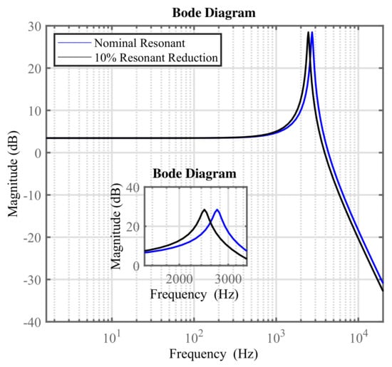 In this section, robustness to resonance frequency changes is evaluated. Robustness is a measure of the insensitivity to parameter changes in the closed-loop system performance [27]. In order for the closed-loop to be unresponsive to uncertainties, a reasonable stability margin is needed to cope with parameter changes. Piezo-driven stage systems are highly susceptible to experiencing variations in the resonant frequency [28]. Different payload masses are applied to the stage, resulting in changing the resonance frequencies of the structure. Therefore, the robustness of the proposed control schemes is tested for both the x- and y-axis for a 10% reduction in resonant frequency. The open-loop frequency response is plotted to mimic loading condition, as is shown in Figure 10.