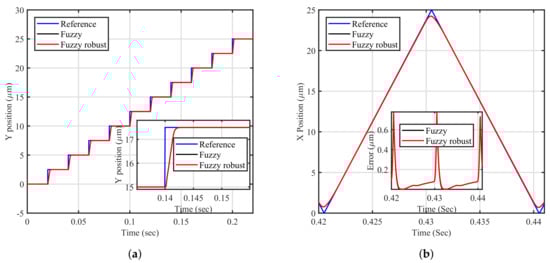 The simulation work is undertaken using the MATLAB Simulink environment. The sampling time is selected as 50 s due to the fast dynamic response of the piezoelectric. In order to test the tracking performance of the proposed control scheme, a staircase signal to drive the y-axis, and a corresponding frequency of 25 Hz triangle signal to drive the x-axis, are applied. The tracking performance of the closed-loop for both the x- and y-axis in single-loop schemes is plotted in Figure 9a,b. It is clear that the fuzzy single-loop tracking (proposed) achieves better performance in tracking the staircase signal as opposed to the single-loop integrator (traditional method). The proposed control scheme provides smoother controller action with no abrupt changes (a smooth transition), resulting in less vibration. The fuzzy single-loop reaches the reference quicker than the traditional method without experiencing vibration, despite experiencing a small delay throughout the dynamics transition. This is due to the use of Gaussian membership function as it is non-zero at all times; in addition, the FLC can handle nonlinearity and vibration due to its rules. Tracking of the traditional method single-loop integrator (traditional method) leads to abrupt changes in the controller action, no matter what tuning method is used, to achieve faster rising time and shorter settling time, the controller action is also not smooth and it causes overshoot.