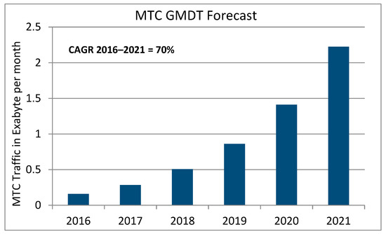 Globally, 325 million MTC wearable devices existed in 2016, where 11 million of them have embedded cellular connections. This figure is anticipated to reach 11.6 billion connected devices in 2021, exceeding the world population in that year [4]. These devices include car GPS systems and tracking devices, smart metering and utilities, health sensors that help patient’s record their health status, home and office security, maintenance sensors, building automation, automotive and consumer electronic gadgets. This growth in smarter devices and MTC connections is an indication of the massive growth of IoT, which brings together people, machines, processes and data, to make mobile computing and machine connectivity very pervasive in the 5G era. MTC capabilities are experiencing an evolution from 2G to 3G, 4G and new wireless technologies. As per Cisco Virtual Network Index (VNI), the traffic size of the M2M category will dramatically increase from 0.157 Exabytes per month in 2016 to 2.224 Exabytes per month in 2021, with a Compound Annual Growth Rate (CAGR) of 70% [4], as shown in Figure 1.