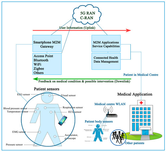 These sensors are classified into three types: (i) “wearable” sensor: where a patient can wear these sensors to start collecting their data. This type of sensor includes temperature, pressure and accelerometer sensors; (ii) The second type is “implantable” in the patient’s body, such as camera pill and insulin level sensors, which need to be injected into the body; (iii) The third category is “stationary” sensors, which are placed in a medical centre for example, so that these sensors will surround patients and be used to collect information about patient behaviours, such as visual sensors—for more details on body sensors please refer to Reference [20]. The connected health diagram is shown in Figure 2, where a group of patients are uploading their information through the wireless local area network (WLAN) of the medical centre. In this scenario, a user can use their smartphone as a gateway for M2M links; the smartphone will periodically collect information from these sensors through e.g., (Bluetooth, Wi-Fi) with a special M2M application made for this purpose. The M2M Gateway sends the data using the 5G cellular network to a special server, which is M2M data management to manage and store the data. After that, these data are sent to a medical centre for monitoring and further processing.