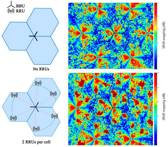 Figure 3. The signal to interference plus noise ratio (SINR) mapping with and without Remote Radio Units (RRUs).