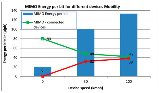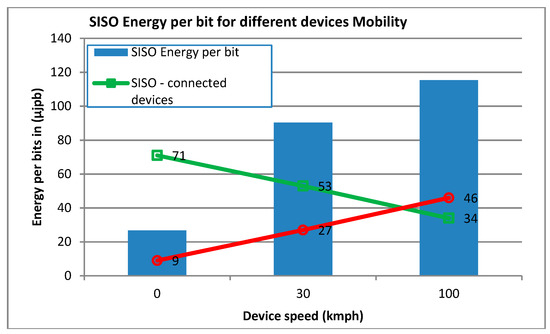 In addition, as the user move faster, there will be considerable increase in handover rate and channel estimation time. This will decrease the data rate of MTC devices, which consequently decrease the number of MTC devices that can be simultaneously connected based on certain bandwidth. A test has been made for 80 sensors with speed of 0 kmph, 30 kmph and 100 kmph and for each speed, the simulation has been repeated to investigate the impact on the connected devices with bandwidth allocation of 5 MHz [39]. Higher mobility of devices will also increase the power consumption of the devices, Figure 7 and Figure 8 show the energy per bit in micro joule per bit (μjpb) for all MTC devices including those in outage (devices that fail to make full data transaction) and for SISO and MIMO.