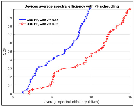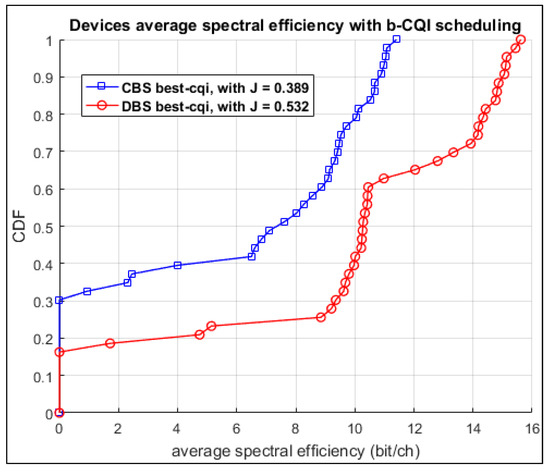 As shown in Figure 10, the peak, average and cell edge data throughput has been shown for both DBS and CBS architecture. The data throughput here is calculated from all successfully transmitted bits from all MTC devices during the simulated TTIs. The simulated time here is the time (in TTI) required by the corresponding MTC devices in order to complete full data transaction, as depicted in Algorithm 1. It is shown that DBS has better average and cell edge performance but it is sacrificing the peak data throughput, except for best-CQI scheduler due to its greedy nature, as it gives its resources to devices having high SINR, ignoring those at the cell-edge. Figure 11, Figure 12 and Figure 13 present the CDF of the MTC average spectral efficiency of the three scheduling algorithms used in Algorithm 1, which show that DBS has improved the system performance in terms of average spectral efficiency in all scheduling algorithms.