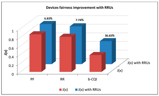 Fairness index j on the other hand has also improved due to the distributed RRUs of DBS architecture. The resources and data throughput in the former architecture guarantee a fairer distribution over the N devices in the simulation model. Figure 14 demonstrates the fairness of CBS and DBS architecture, where DBS shows better resource fairness, the data label shows the percentage gain in fairness of DBS over CBS network, due to the spatial distribution of remote antennas.