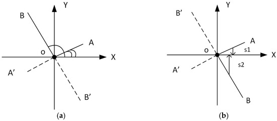 Gradient conversion to two quadrants: (a) classical histogram of oriented gradients (HOG) approach: gradients OA’ and OB’ are converted to OA and OB, respectively, and represented by the angles which are in the 0–180° interval; (b) new computation method: gradients OA’ and OB’ are converted to OA and OB, respectively, and represented by the slopes s1 and s2 which are in the [−90, 90] interval.