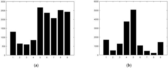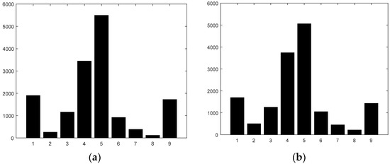As can be seen, the two histograms look very different. Upon closer inspection, we can see that in the histogram based on arctangent, the most important angles correspond to 90°, 0° (Bins 1 and 9), and angles close to 180°. For the histogram based on slope, we can see that the important bins correspond also to small slopes, close to zero (Bins 5 and 6), and to very large slopes (Bins 1 and 9). However, the magnitude of bins corresponding to small slopes in Figure 2b is larger than that of bins corresponding to low angles in Figure 2a, whereas the magnitude of bins with large slopes is less important in Figure 2b compared with in Figure 2a.