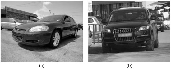 For tests, we used a combination of static images from several databases as well as from pictures we took in traffic (highway, rural, and in town). These can be found and downloaded at [31]. We created two sets of training and test images. Thus, for Training Set 1 we used a combination of images provided by [32,33] for cars and non-cars, respectively. For Test Set 1 we used pictures from [34]. Training Set 1 consisted of 1700 negative images and 500 positive ones. Test Set 1 consisted of 113 pictures with no cars and 115 pictures with cars. For Training Set 2, we used our own pictures as well as selected pictures from [32]—in total, 848 negative images and 655 positive images. For Test Set 2, we used our own pictures, with 182 negative images and 120 positive images. The training and the test images had the size of 220 × 160 pixels. An example of images from each of the two sets is presented in Figure 3.