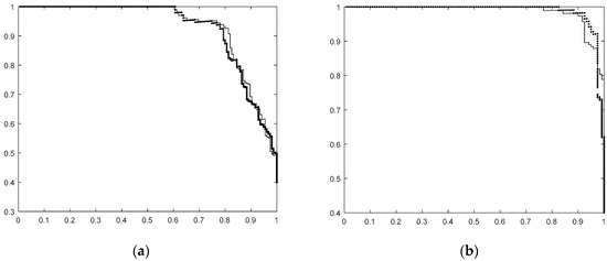 This is confirmed by the precision-recall curves. In Figure 4a,b we show this curves for the first two situations (corresponding to first two lines in Table 2). The precision–recall curves we present are based on the classifier score. As can be seen, the curves are very similar in both situations. For the classifier using the HOG based on gradient slope the curves look, in the region of interest, slightly worse for Set 1 and slightly better for Set 2 compared to that using the original HOG.