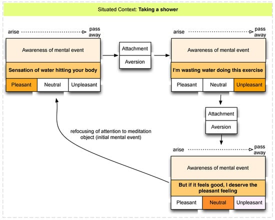 In this example, the situational context of one’s daily activity (e.g., showering) becomes relevant. It becomes the meditation object of interest, allowing the attention to include not just breath, but sounds, body sensations, smells, and interactions with the physical space you are situated in.