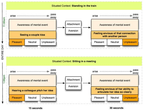In this study, the proposed situated mindfulness approach designed in one of the interventions can be considered a series of hyper abbreviated meditations across a day. For instance, as illustrated in Figure 3, while an individual is situated in everyday contexts like sitting on the train or sitting in a meeting, they can spontaneously engage in brief moments of noticing mental events and one’s reactions, and move on.