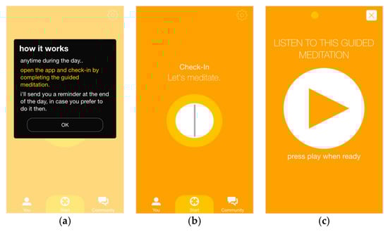 In the mindfulness meditation (MM) intervention, participants were prompted to complete a daily challenge called “Guided Meditation” five times throughout the week. Participants were instructed to complete the meditation at “anytime during the day”, and were sent reminders at the end of the day if they did not complete the meditation right away or before the end of the day. To engage in guided meditation participants first clicked to “check-in” (Figure 4b) and then played the audio (Figure 4c), which consisted of a 13-min guided audio. The script was adapted from the Garland et al. [24] study. After completing the audio meditation, participants were prompted to immediately complete the Toronto Mindfulness Scale (TMS) through the mobile device.