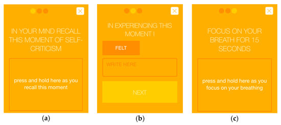 Screenshots of the situated mindfulness intervention: (a) recalling moment; (b) attentional shift; (c) body awareness.