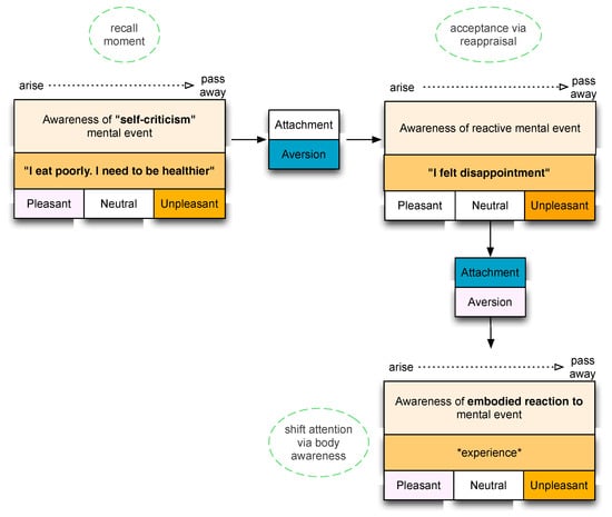 Figure 6 conceptually depicts the end-of-day experience for participants using the BPM. The process begins with recalling a moment observed (e.g., self-criticism). Then reappraisal takes place in the form of acknowledgement of a reaction—“I felt disappointment”—rather than attempting to control or analyze the thought—“I shouldn’t be so self-critical”. However, the subsequent interaction of body awareness seeks to facilitate an attachment to this reaction. By embracing the reaction through an embodied guidance of breath awareness, one comes to ‘be with’ this unpleasantness—an experiential form of acceptance of one’s reaction.