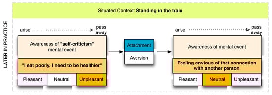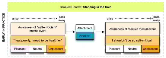 In contrast, the later experiences with SM had greater aspects of decentering during observation of instance of self-criticism, stemming from repeated engagement with the retrospective reflection activity that was prompted at the end of each day. The guided interactions provided at the end-of-day transferred into day-to-day engagements with observed mental events. As such, early experiences depicted in Figure 7, shifted to experiences where body awareness as a reaction to the mental event was embraced and felt—characterizing a form of attachment and acceptance underlying a decentered state.