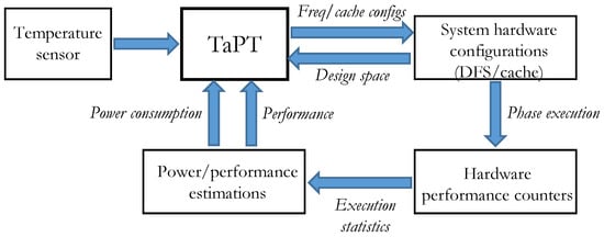 TaPT leverages several fundamental assumptions based on mechanisms that have been widely studied and implemented in embedded systems [11,26]. Figure 2 depicts TaPT’s synergistic interactions with different system components to dynamically optimize the system. We assume that DFS is enabled, and the system features a configurable cache with tunable size, associativity, and line size. We also assume that the system has temperature sensors that can be read by a continuous system telemetry mechanism for collecting and analyzing sensor data. Most current microprocessors contain hardware performance counters that generate execution statistics, such as cache miss rates, instructions per cycle, etc. These statistics are used in combination with low-overhead analytical models to estimate the power/energy consumption and performance [26], which are used by the TaPT characterization algorithm for determining the best configurations.