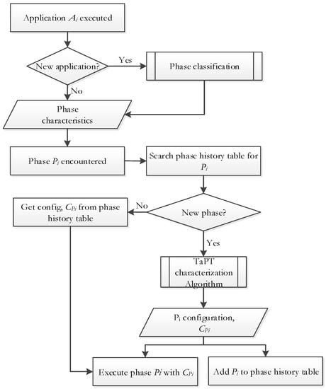 To minimize tuning overhead, TaPT only tunes distinct phases and uses the determined configurations for re-occurrences of that phase. To store information about previously executed phases, including their best configurations, TaPT features a low-overhead phase history table. When a phase is executed, if is in the phase history table, has been previously executed— is a not new phase—and the system is reconfigured to the stored best configuration , which is then used to execute . Otherwise, if there is no entry for in the phase history table—i.e., is a new phase—TaPT determines ’s best system configuration using the characterization algorithm (Section 3.3). is then stored in the phase history table for subsequent executions of , and is executed using .