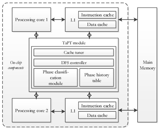 Figure 4 depicts the TaPT architecture for a sample dual-core system, which can be extended to any n-core system. The on-chip components include processing cores that are connected to the L1 caches and the TaPT module. Without loss of generalization, we assume that the L1 caches are directly connected to off-chip main memory, and since this hierarchy implies that there is no dependence between the caches, the caches can be tuned independently. We note that this is a viable assumption with respect to current state-of-the-art microprocessors [4].