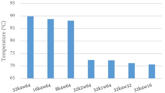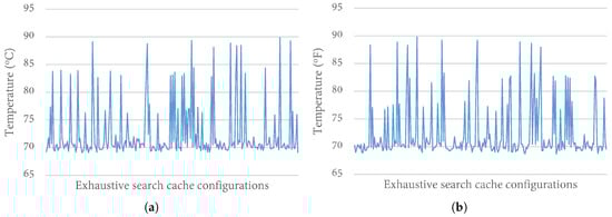 Figure 5 depicts the temperature variations over all the cache configurations in the design space for and with the clock frequency set at 2 GHz. In general, the peak temperatures ranged from 69 °C to 90 °C, with a standard deviation of 5. As expected, the base configuration, with the largest cache configuration had the highest temperature. Since the impact order of cache parameters on energy consumption has been widely used for developing cache tuning heuristics for energy consumption [11,39], we also analyzed the trend in temperature changes as the cache configurations changed. We observed that the temperature changes did not follow the same trend as energy changes. This observation implies that previous knowledge of the impact order of cache parameters on energy consumption does not apply to temperature optimization.