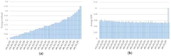 Figure 7a,b illustrates the relationships between the TaPT parameters, and the tuning overhead and EDP, respectively. The x axes represent the TaPT parameters, denoted as “”, where and z represent the population size, number of generations, and archive size, respectively. For brevity, not all the TaPT parameters are shown on the figures, however, the shown parameters are representative of all the TaPT parameters. Figure 7a shows that the tuning overhead increased steadily for the TaPT parameters, ranging from 2% to 35% tuning overhead. However, Figure 7b shows that an increase in tuning overhead did not necessarily result in EDP reduction. The EDP achieved by different TaPT parameters did not change significantly as the design space increased. Thus, we performed additional analysis to identify TaPT parameters that achieved sufficient tradeoffs between tuning overhead and optimization efficiency.