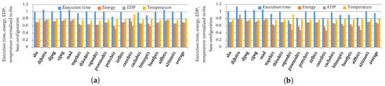 To illustrate TaPT’s optimization capabilities with a low temperature threshold and priority setting T (prioritize temperature), Figure 9a depicts the execution time, energy, EDP, and temperature savings with a 65 °C temperature threshold and priority setting T. On average, over all the phases, the energy and temperature decreased by 13% and 25%, respectively. However, as a result of the low temperature threshold, the execution time and EDP significantly increased by 39% and 22%, respectively. TaPT maintained the peak temperature within 65 to 68 °C for all the phases. However, TaPT traded off execution time and energy consumption in order to maintain this low peak temperature. Increasing the temperature threshold to 70 °C (results omitted for brevity) decreased the energy, EDP, and temperature by 27%, 26%, and 21%, respectively, while the execution time only increased by 2%. These results illustrate TaPT’s ability to trade off optimization goals in order to adhere to design constraints. The results also illustrate the potential conflict between different optimization goals; some optimization goals may be adversely affected in a multi-objective optimization scenario where one of the objective functions is significantly constrained.